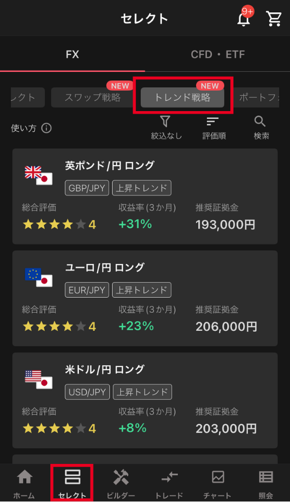 「セレクト」メニュー>「トレンド戦略」をタップ