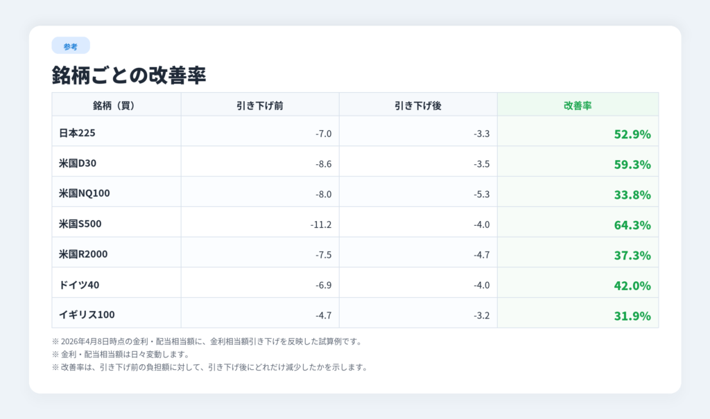 これにより、日をまたいでCFDの建玉を保有した場合にかかるコストが従来より低く抑えられ、お取引いただきやすくなります。