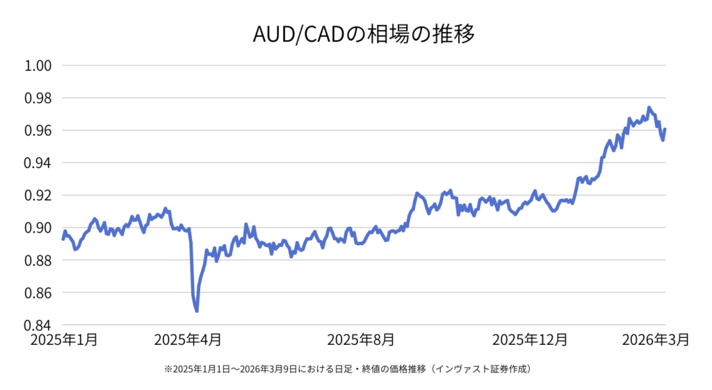 今回のように原油価格が上昇する局面では、カナダドルが相対的に強くなることがあり、AUD/CADでも値動きが出る可能性があります。中東情勢や原油市場の動きによって、通貨の強弱が変化することがあるため、今後のニュースにも注目が必要です。