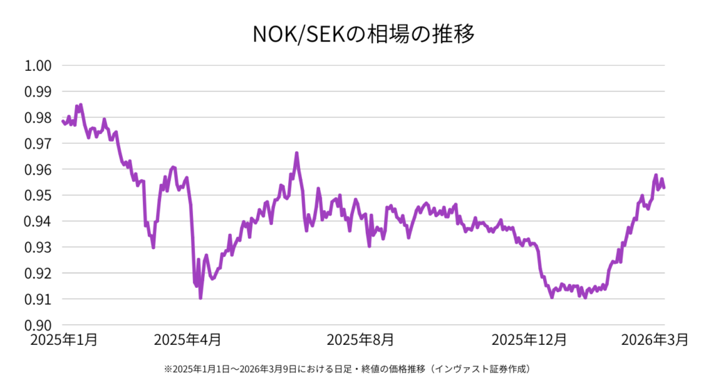 NOK/SEKはノルウェークローネとスウェーデンクローナの通貨ペアです。ノルウェーは北海油田を持つ主要な原油輸出国であり、原油価格の上昇はノルウェークローネを支える要因になることがあります。
