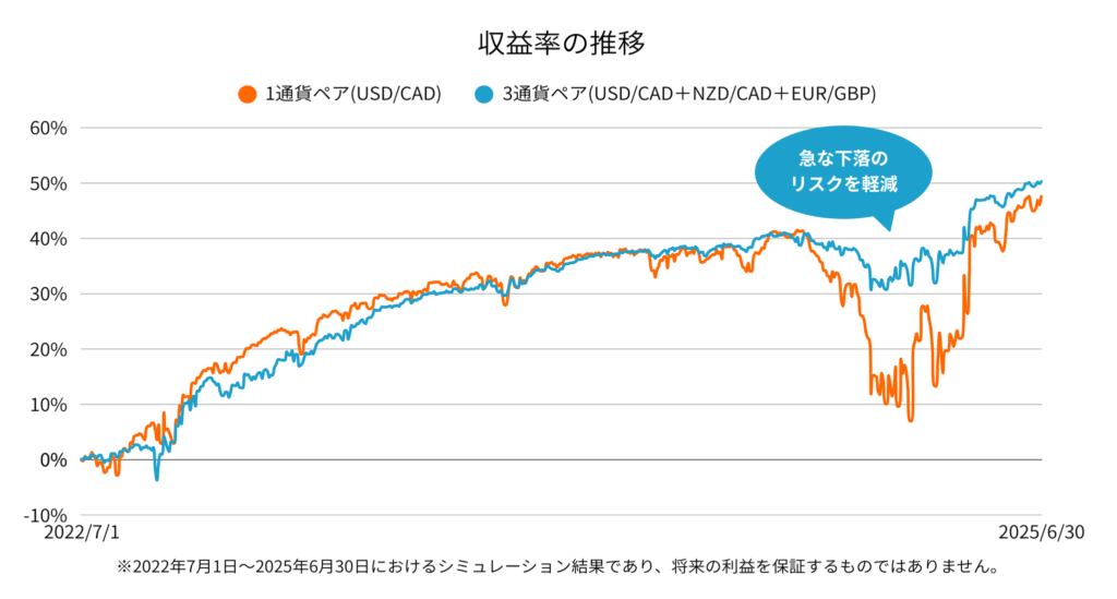 相場環境によって通貨ペアごとに値動きの特徴は異なります。値動きの傾向が異なる通貨ペアを組み合わせて運用することで、相場変動の影響を分散できる可能性があります。